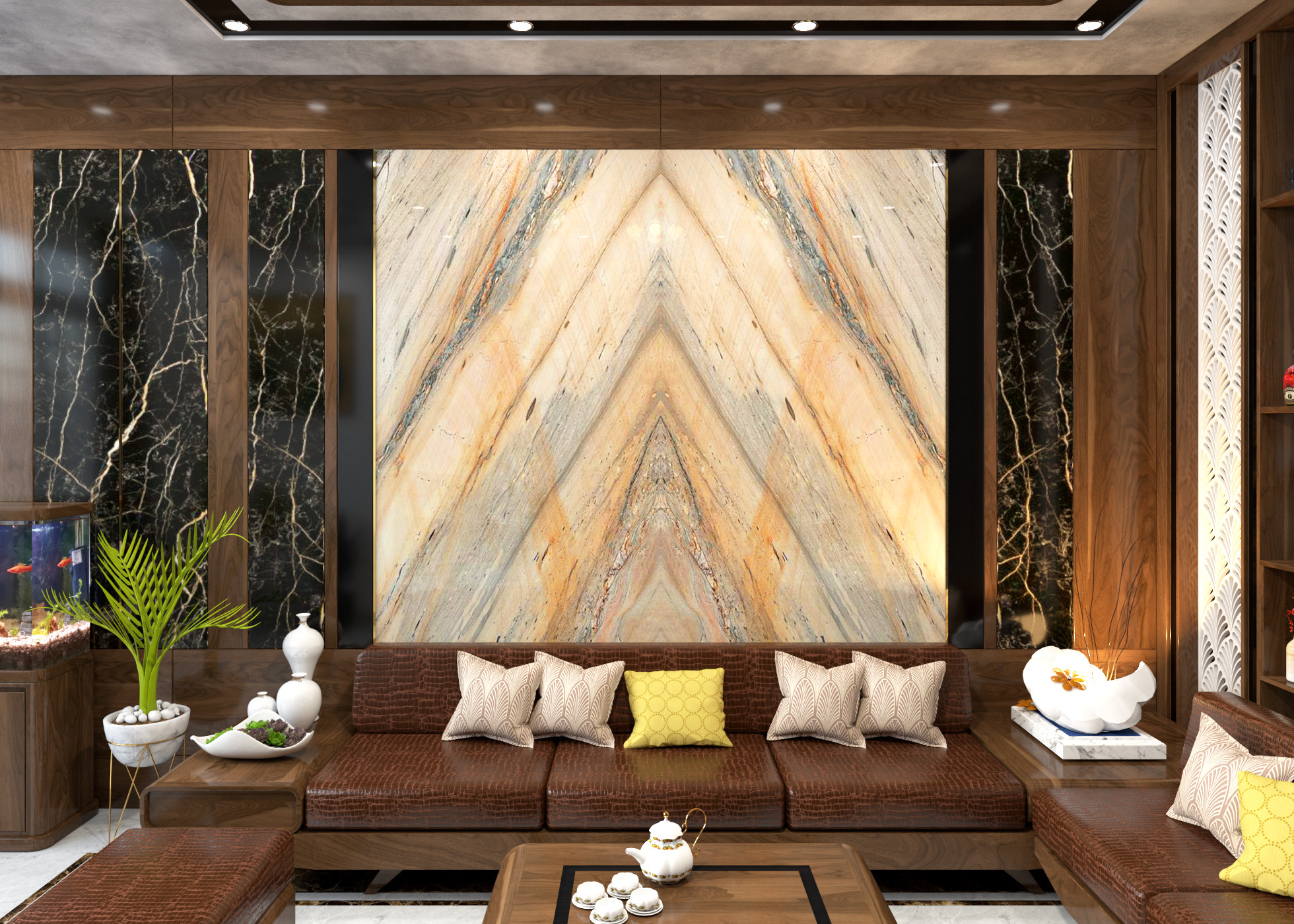 Mẫu đá có vân như tranh thủy mặc, rất được ưa chuộng trong phòng khách và sảnh lớn.