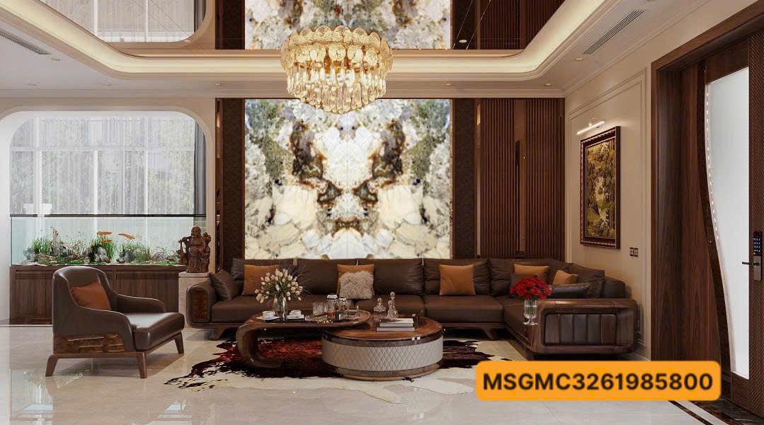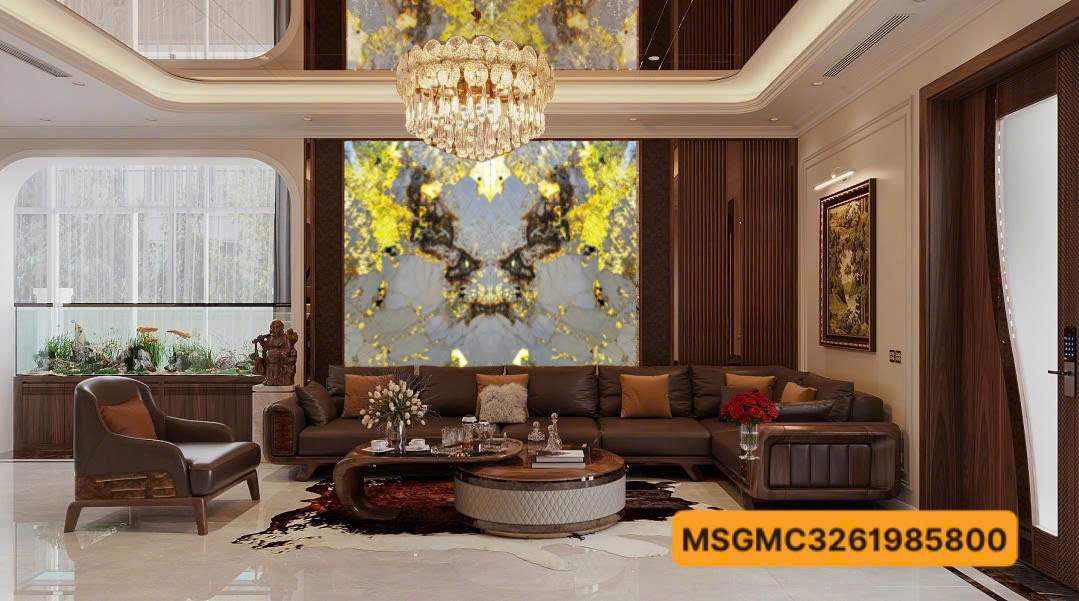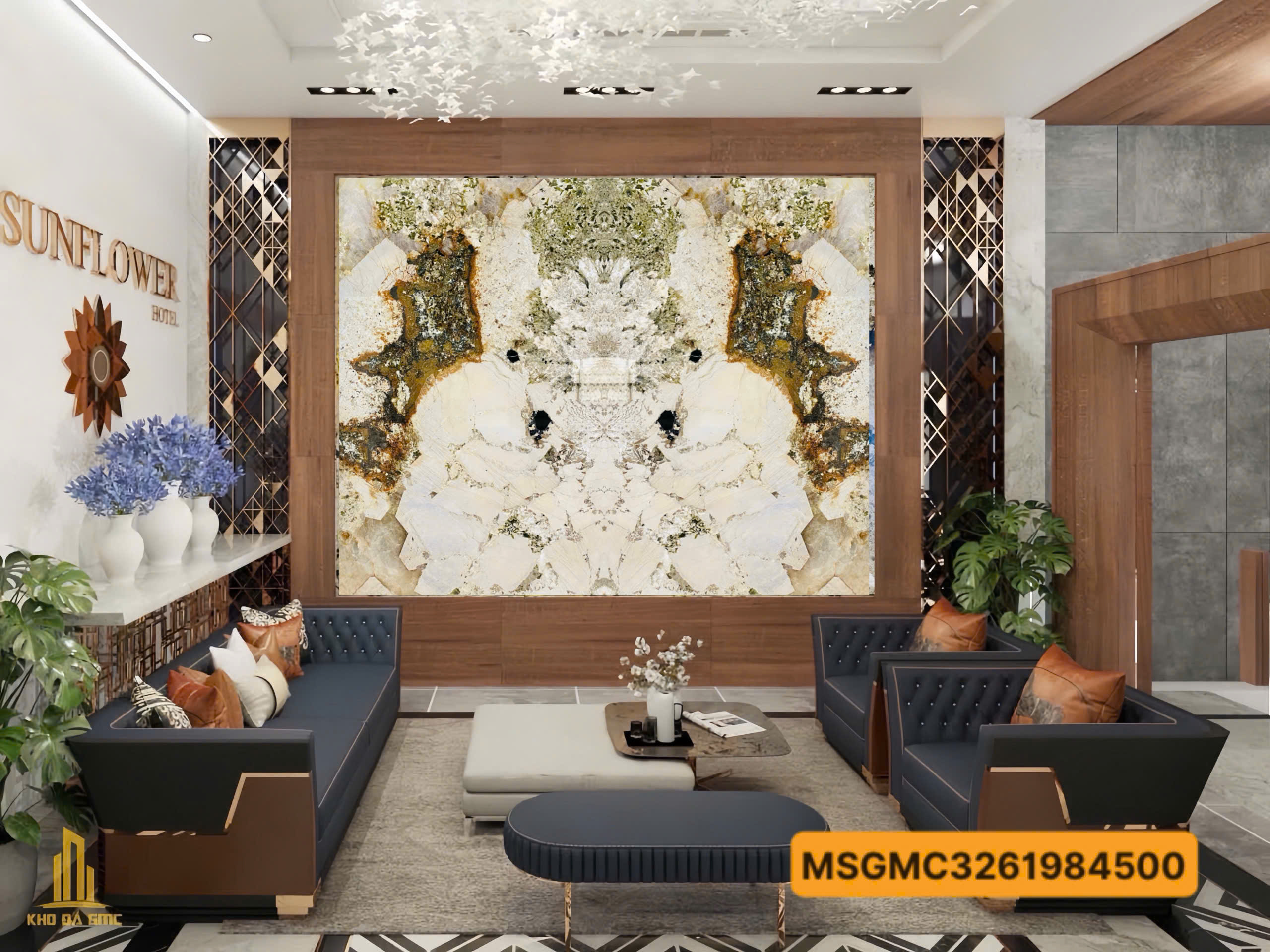 Vân đá mảnh như tuyết rơi tạo nên hiệu ứng nghệ thuật cao cấp, phù hợp với phòng khách, sảnh biệt thự hoặc khu vực lễ tân của khách sạn, nhà hàng.